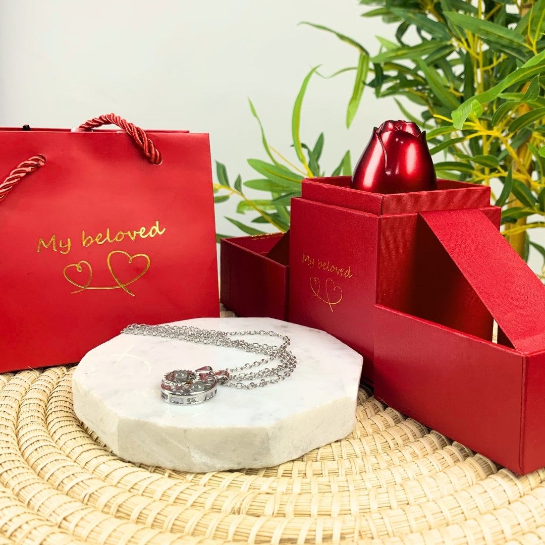 ✅Incluye: 2 collares (Sol y Luna), proyección personalizada con foto y mensaje "I Love You" en 100 idiomas, caja tipo joyero en forma de rosa.