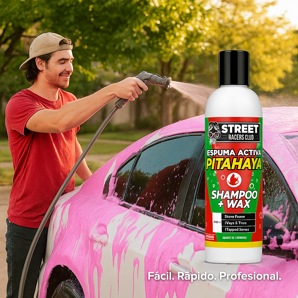 ESPUMA ACTIVA PITAHAYA es una fórmula innovadora 3 en 1 que combina shampoo, cera y espuma activa de color para brindar una limpieza profunda, desengrase y un acabado brillante a tu auto, todo en una sola aplicación.