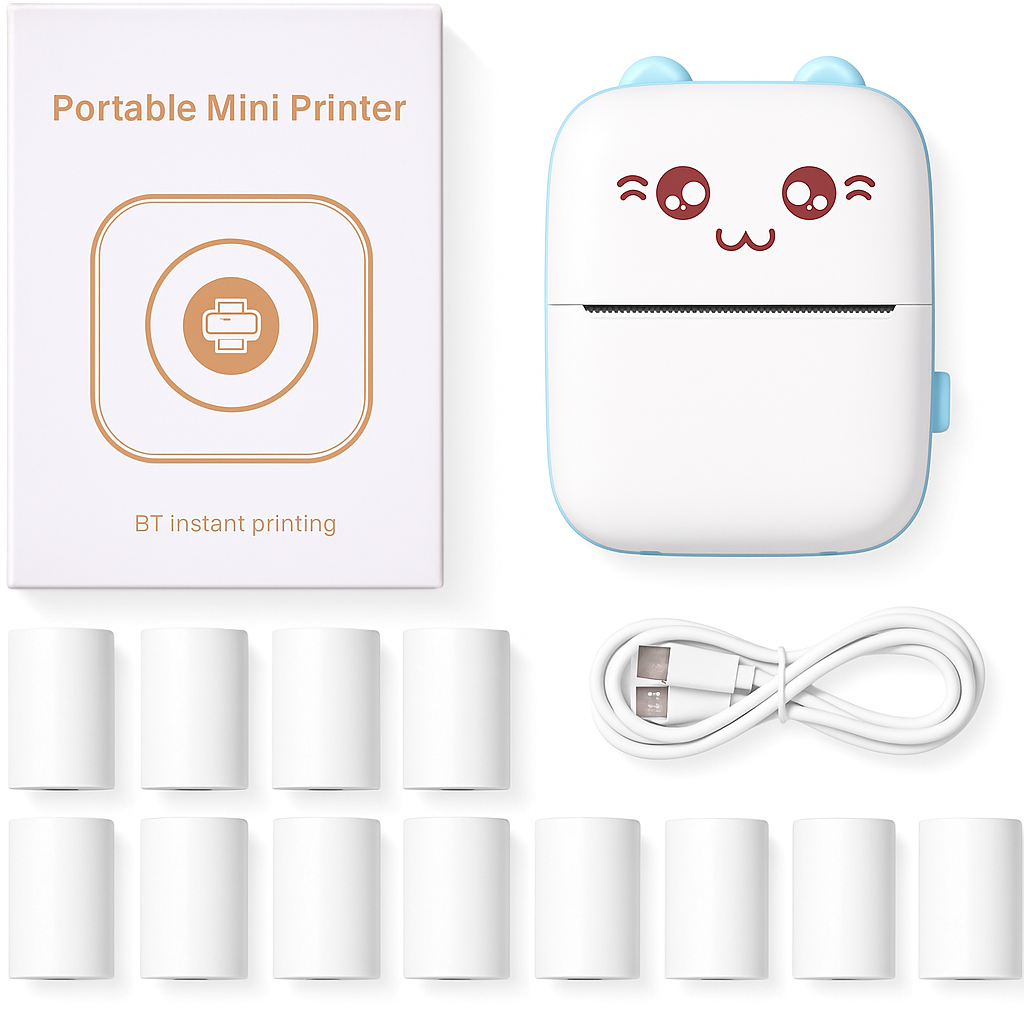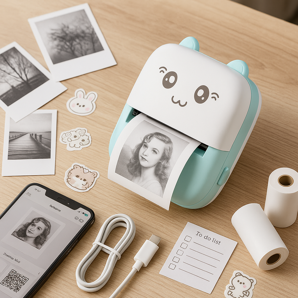 Mini impresora térmica portátil de 57mm con Bluetooth. Sin tinta, sin cables, sin complicaciones. Imprime fotos, tareas, tickets, códigos QR y más desde tu smartphone. Perfecta para estudiantes, emprendedores, creativos y amantes del bullet journal.