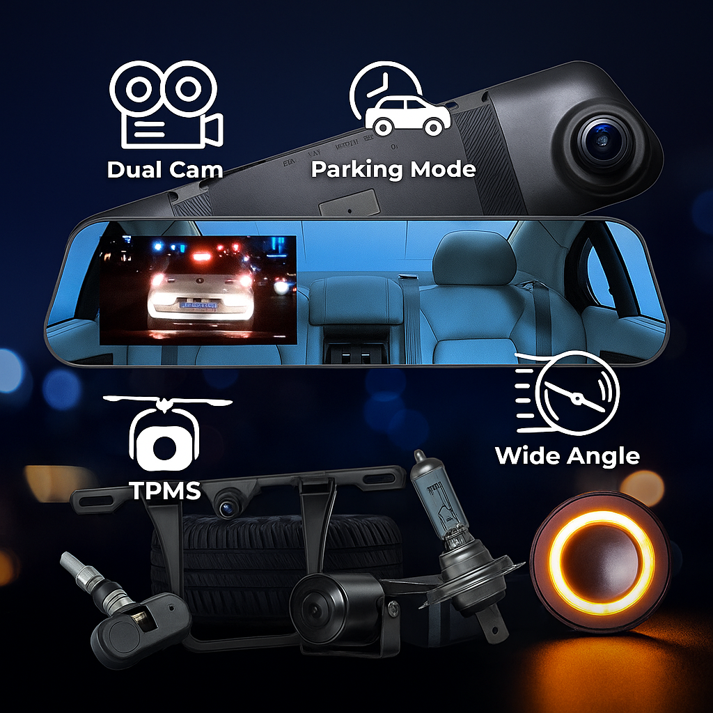 Haz que tu conducción sea más segura y moderna con nuestro Espejo Retrovisor con Cámara Frontal y de Retroceso.